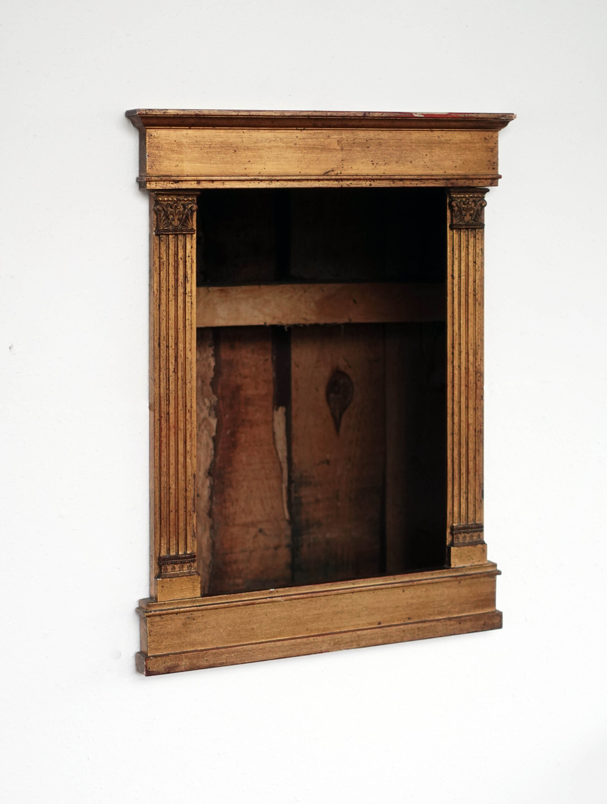 Die vorhandene Grafik wurde aus dem Rahmen entfernt. Ein formgleicher Ausschnitt ist aus der Holzwand hinter dem Rahmen entnommen worden. Der dunkle Raum hinter dem Rahmen ist einsehbar.